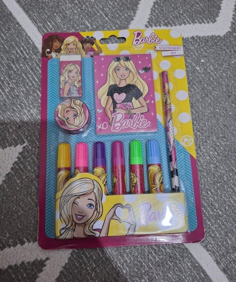 Barbie temalı, renkli kalemler, silgiler, kalemtraş ve kurşun kalem içeren kırtasiye seti. ️