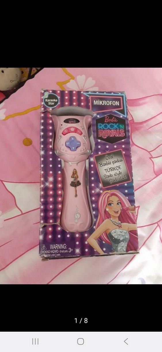 Barbie renkli pembe mikrofon oyuncak, Türkçe şarkılar ve karaoke fonksiyonları içerir, 3 yaş ve üzeri çocuklar için uygundur.
