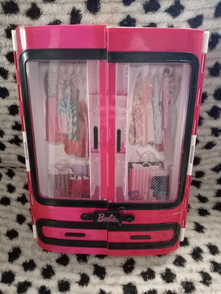 Renkli pembe Barbie çocuk dolabı, şeffaf kapaklarında asılı kıyafetler ve aksesuarlar içerir. Çocuk kıyafetlerini düzenlemek için uygun.
