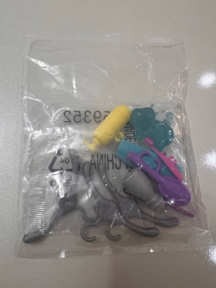 Çok renkli çeşitli şekil ve renklerde oyuncak ve bakım araçları içeren kedi aksesuar seti.