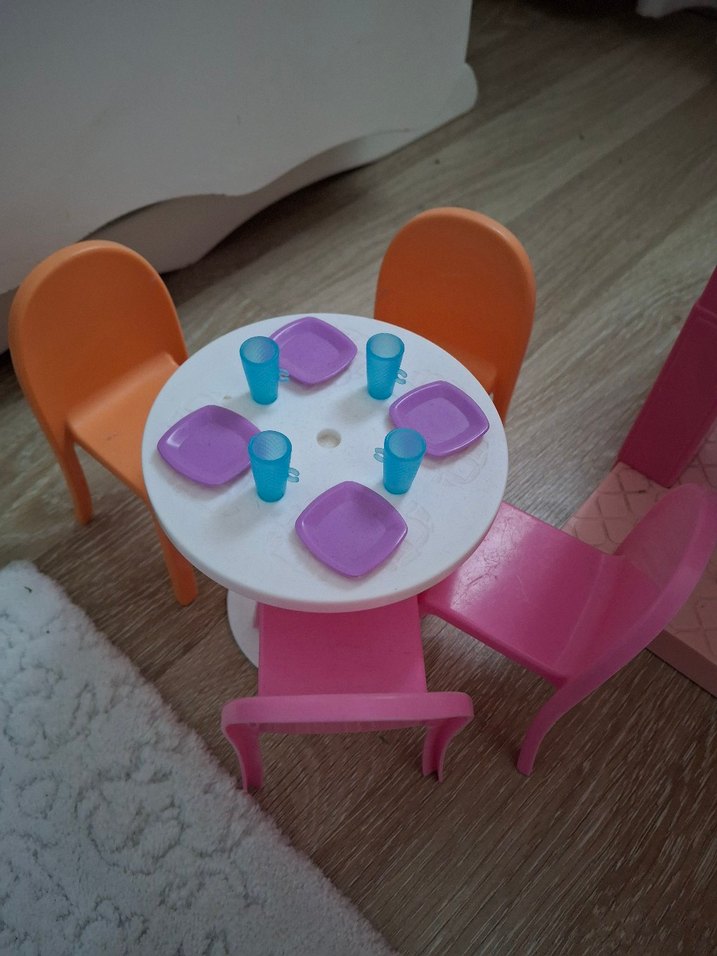 sorunsuz,pastel renklerde, beyaz yuvarlak masa, pembe ve turuncu sandalyeler ile küçük mor tabaklar ve mavi bardaklar içeren çocuk oyun seti.
