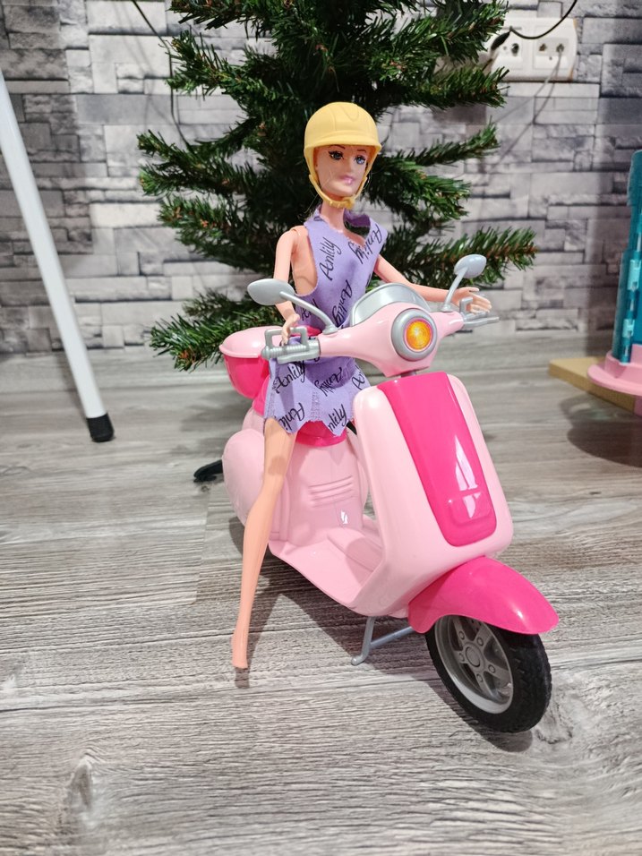 Pastel pembe çocuk scooter'ı, ön far ve yan aynalarla klasik tasarıma sahip. Kasklı ve elbiseli bebek figürüyle eğlenceli detaylar sunar.