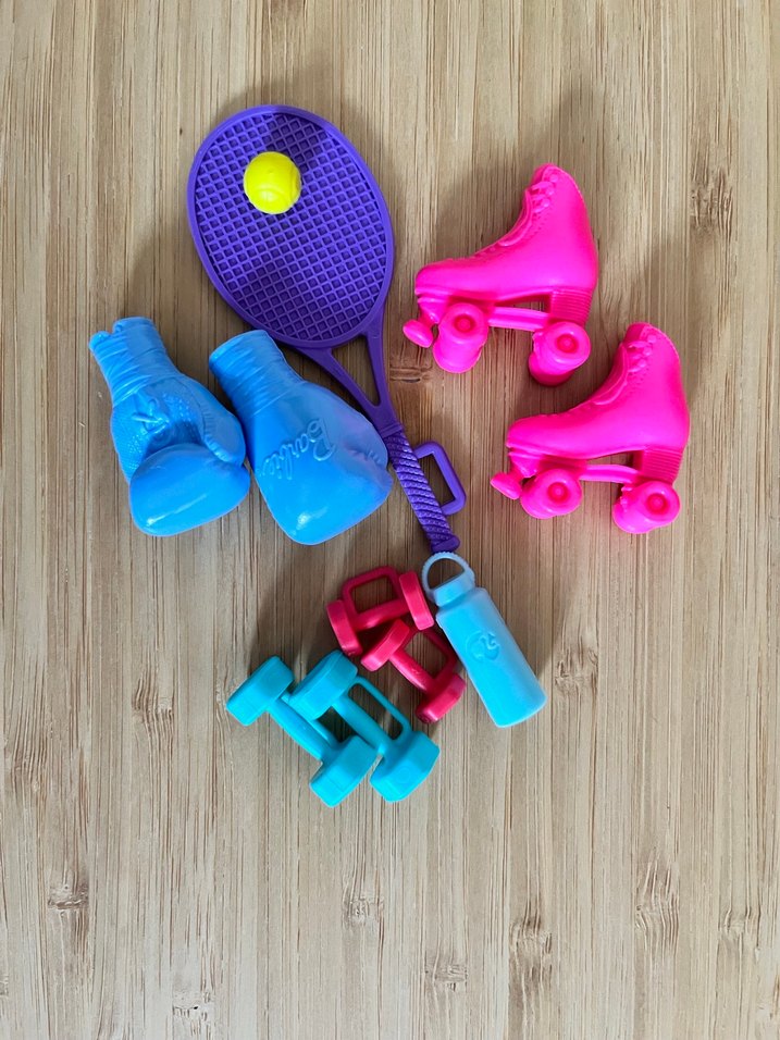 Boks eldiveni, paten, dambıl ve tenis raketinden oluşan renkli mini spor oyuncak seti. Eğlenceli oyunlar için idealdir.
