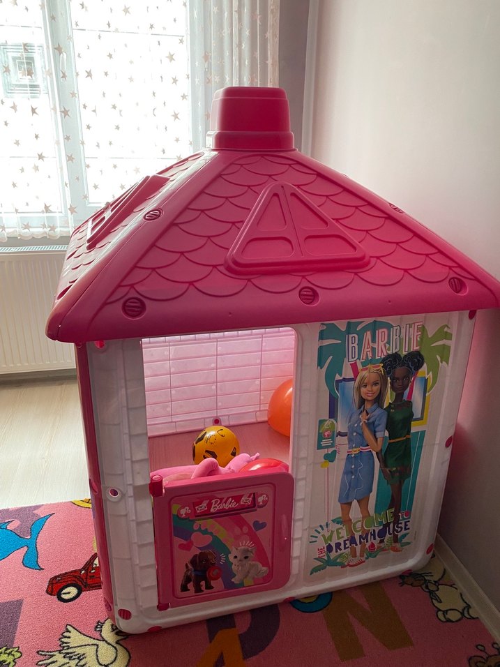 Barbie temalı, detaylı çatısı ve kapısı olan renkli pembe oyun evi.