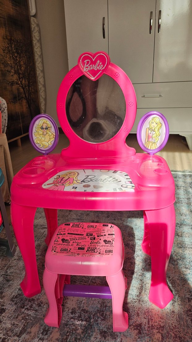 Barbie temalı büyük oval aynası ve iki küçük yan aynası olan renkli pembe çocuk şifonyeri. Üzerinde baskılı detaylı uyumlu taburesi vardır. Taburesinde çok az renk soyulması dışında hiçbir problemi yoktur. Ürün Ankara altındağ da bulunur. İlk tercihim elden alınmasıdır.