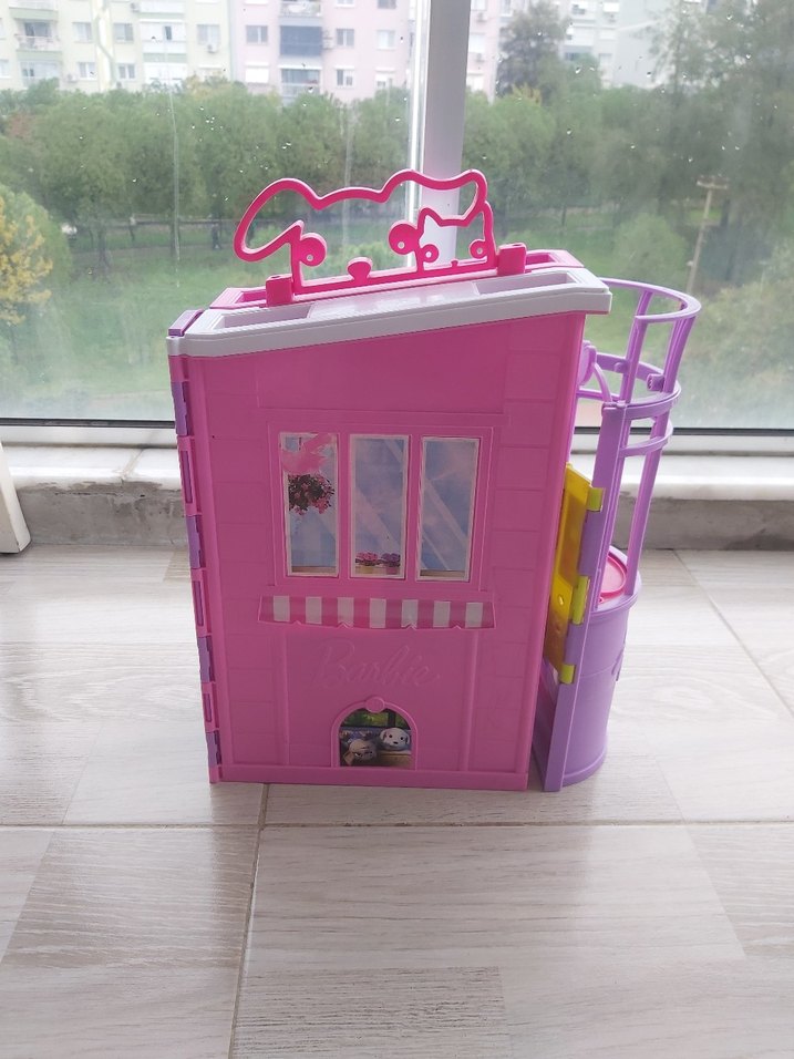 Pembe renkte, pastel tonlarda küçük balkonlu ve pencere detaylı oyuncak ev. Çatı üzerinde köpek ve kedi figürleri bulunur. #barbie #barbieveterinermerkezi #veteriner #oyuncakev