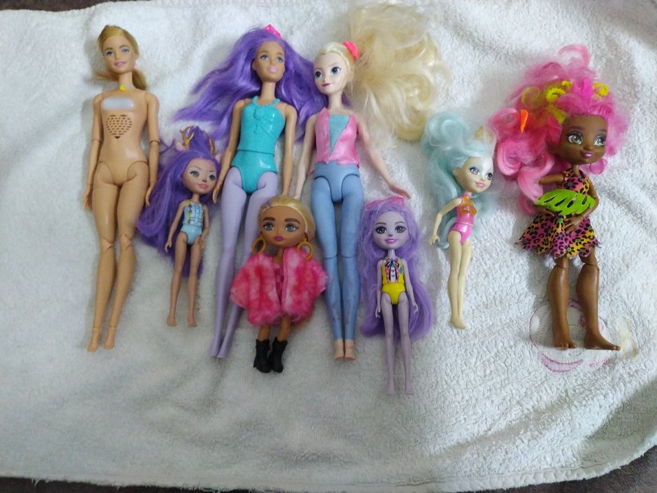 Canlı renklerde saç ve kıyafetlere sahip çeşitli tarzlarda renkli bebek seti.