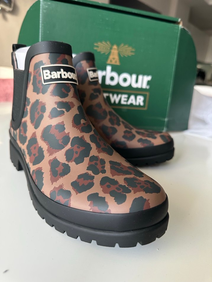 Barbour markalı kahverengi leopar desenli kauçuk botlar, blok topuklu ve tokalı detaylıdır. Sokak stiline uygundur.