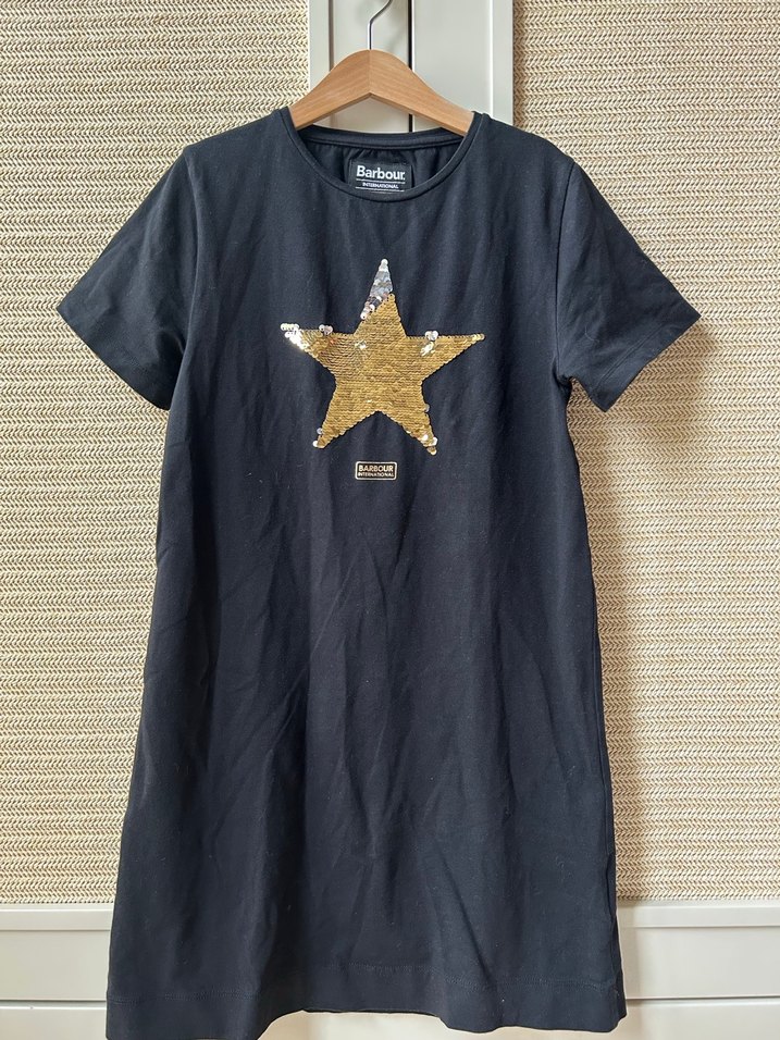 Siyah renk, altın payetli parlak yıldız baskılı, kısa kollu, yuvarlak yaka, bol kesim kız çocuk tişörtü. Yumuşak dokulu kumaştan üretilmiştir. ⭐