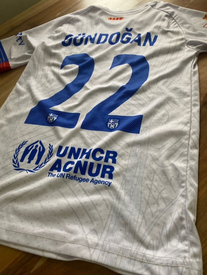Ürün temiz bikaç gün kullanıldı 8 9 yaş için ürün altı hediye Beden Temsilidir Beyaz, kısa kollu, baskılı Gündoğan 22 numaralı forma, UNHCR logosu ve velcro detayları ile. Yuvarlak yaka, sentetik kumaş kullanılmış ⚽