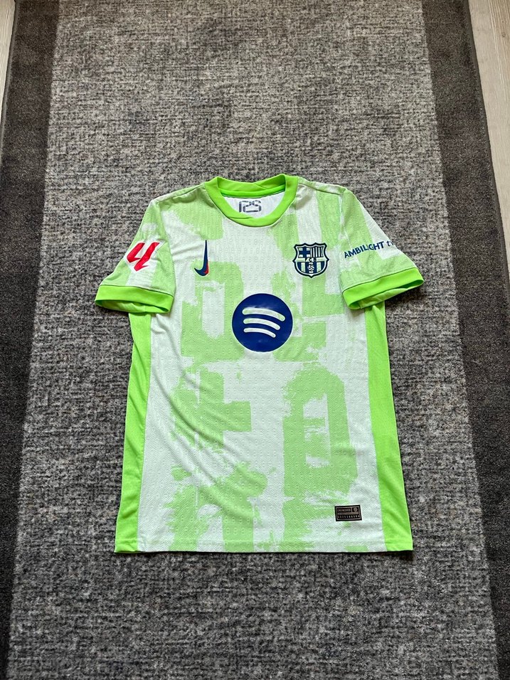 Bu erkek yeşil kısa kollu spor tişörtü, bisiklet yaka ve vücuda oturan kesime sahiptir. Hafif sentetik kumaştan üretilmiş, baskılı desenler ve cırt cırt detayları içerir. ⚽
