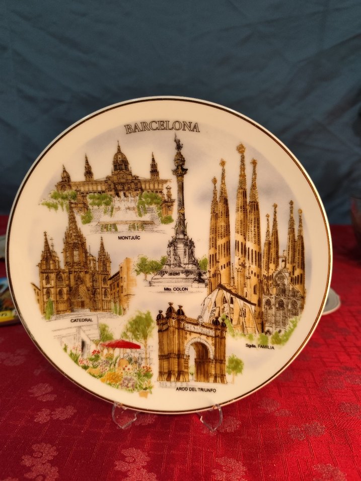 Barcelona'nın Montjuïc, Colón, Katedral, Zafer Takı ve Sagrada Familia gibi simgeleri baskılı geleneksel bir tabak. Üzerinde "BARCELONA" yazısı bulunur. ️ Barcelona etrafı altın yaldızlı dekoratif tabak Kırığı yoktur temiz ürün