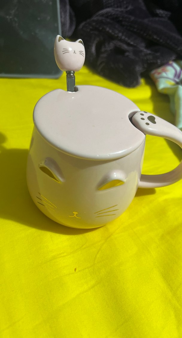 Kedi yüzü desenli beyaz kupa, kapaklı ve pati izi detaylı kaşığıyla birlikte. Sıcak içecekler için uygun.
