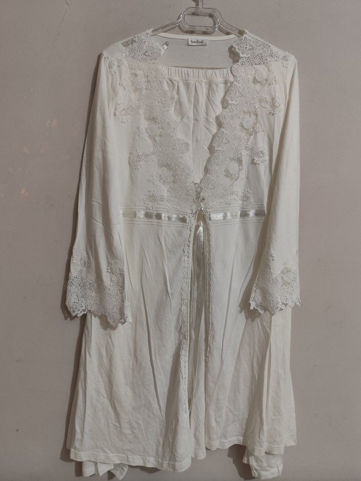 Uzun beyaz sabahlık, hafif nakışlı, bol kesim ve uzun kollu, bohem tarzını yansıtıyor. Sabahlik. ve Pijama Sıfır. ürün hiç kullanılmamış