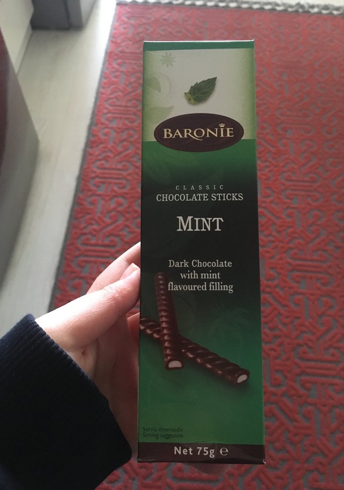 Baronie bitter çikolata çubukları, nane aromalı dolgusu ile 75g ağırlığında. Klasik tatlı, yoğun çikolata ve ferahlatıcı nane birleşimi.