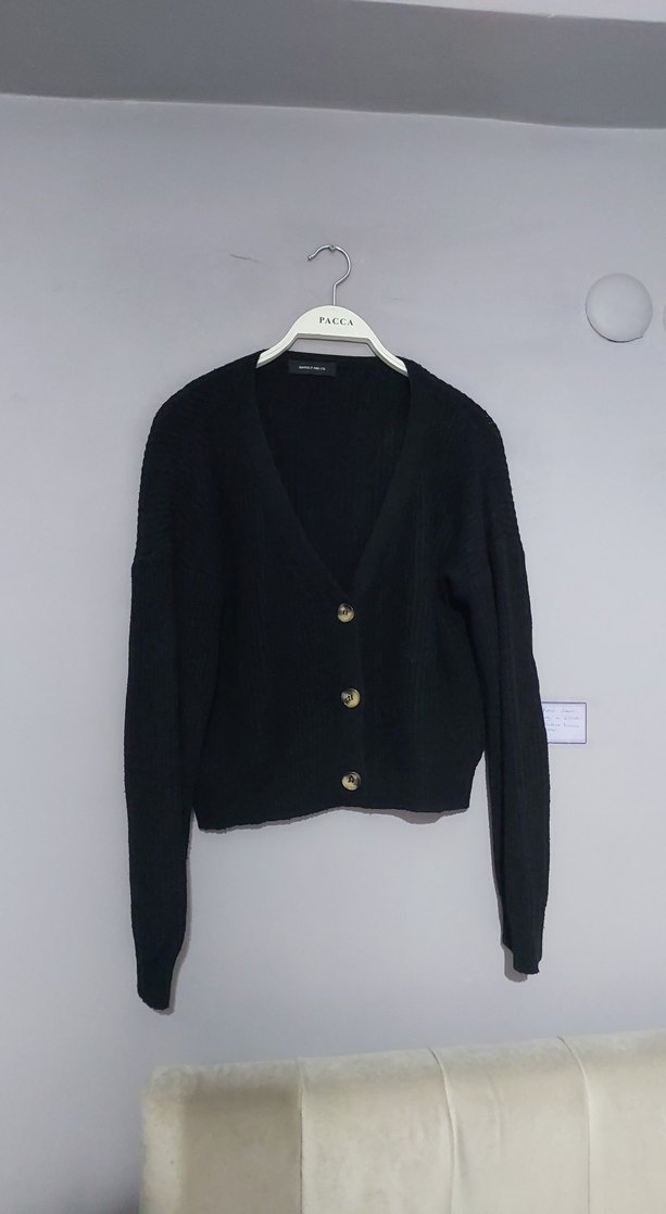 Siyah yün, V yakalı, düğmeli, uzun kollu, midi uzunlukta ve bol kesim kadın hırka. Rahat ve günlük sokak stili için uygundur.