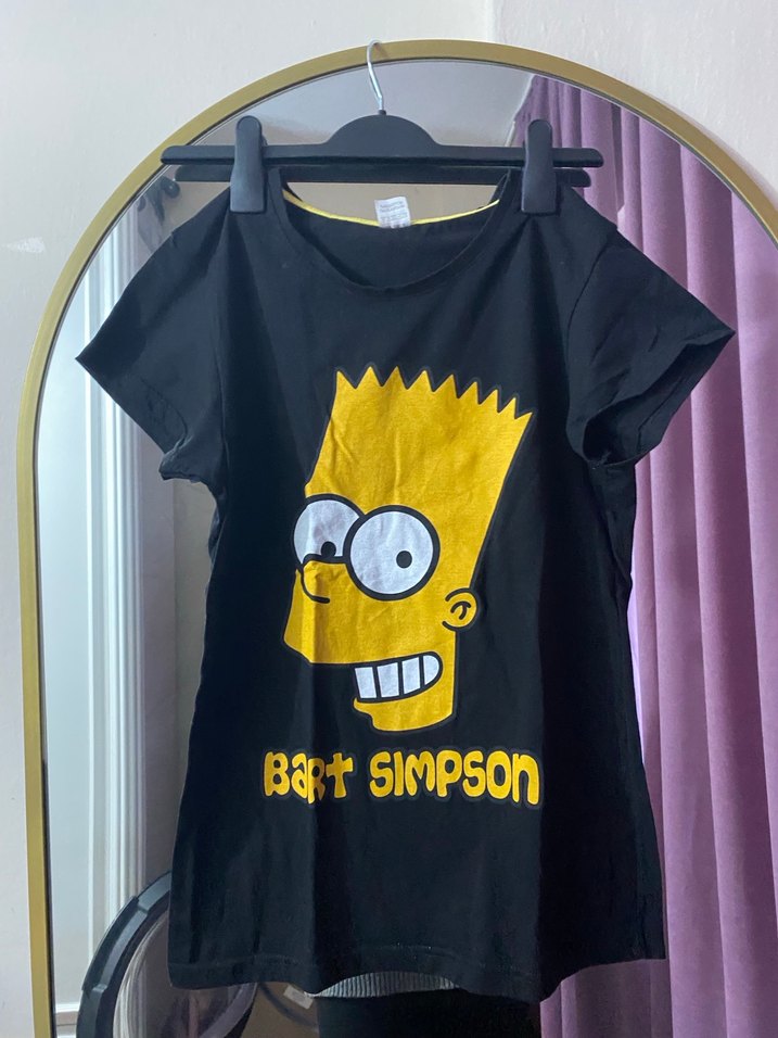 Siyah renkli kız tişörtü, pamuklu kumaştan, kısa kollu ve yuvarlak yaka. Bol kesim ve canlı Bart Simpson baskısıyla rock punk tarzını yansıtıyor.