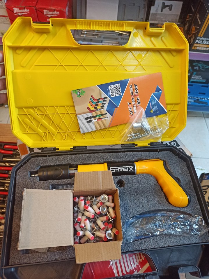 S-max sarı renkli tabanca ve aksesuarlar, dayanıklı kutuda yer alır. Hassas uygulamalar için uygundur.