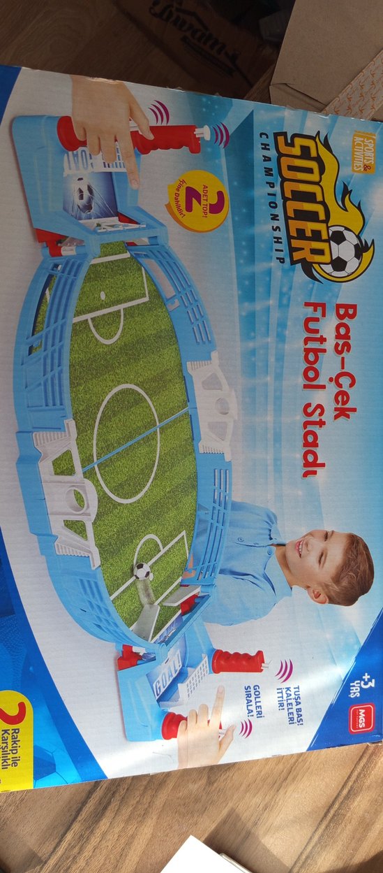 İki bas-çek araba ve mavi çitlerle çevrili mini futbol sahası içeren futbol stadı oyunu. ⚽