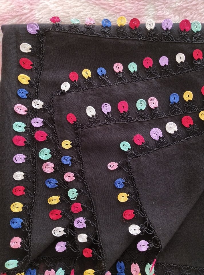 siyah yazma kenarları renkli iplerle yapılmış iğne oyası.siparis ile farklı renklerde de yapılır