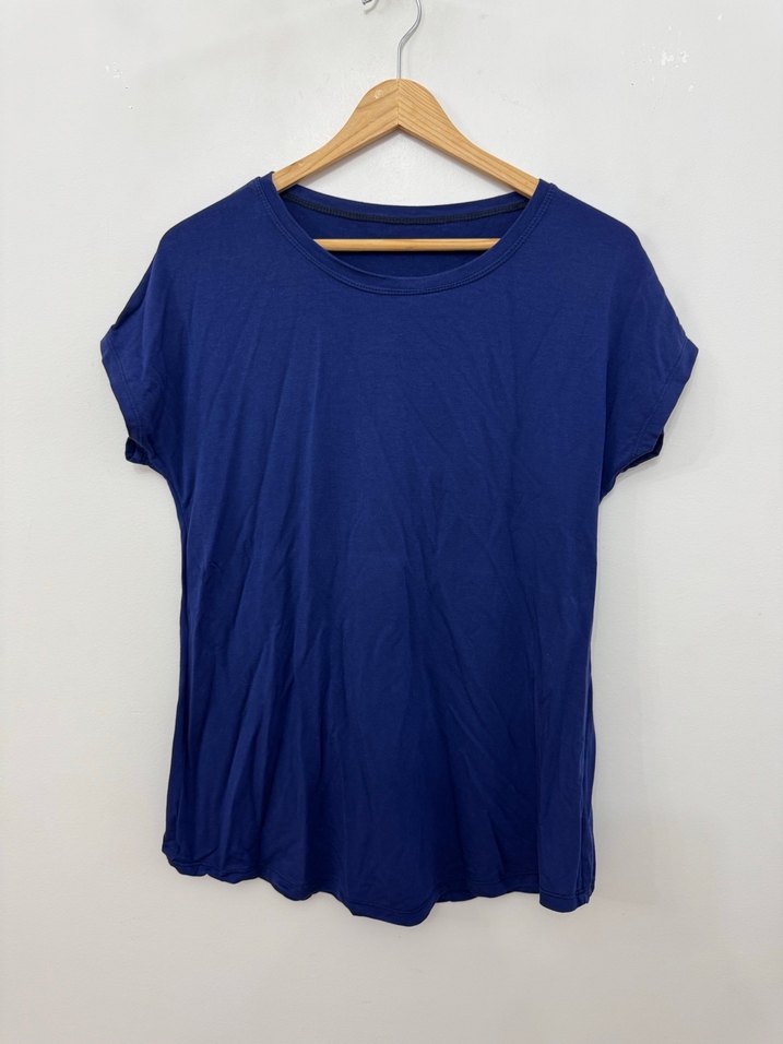 Kadınlar için koyu mavi renkli, kısa kollu ve yuvarlak yakalı tişört. Yumuşak keten kumaştan, salaş kesim ve normal boyda, günlük ve spor tarz için uygun.