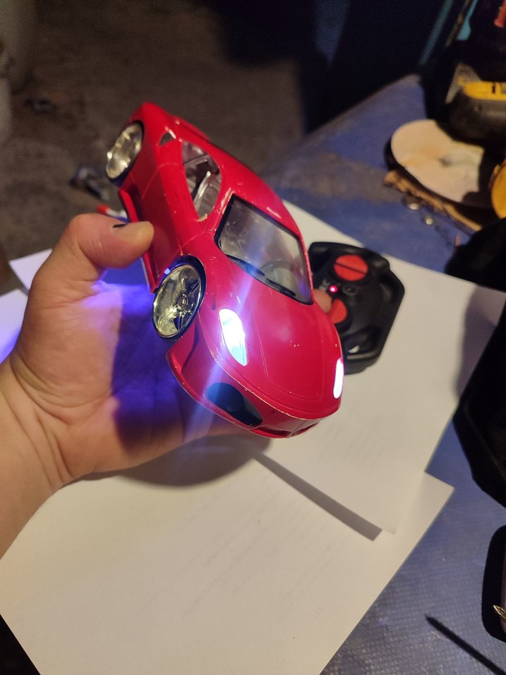 Kırmızı oyuncak arabanın parlak farları ve uzaktan kumandası vardır, eğlenceli ve etkileşimlidir. kumandanın pil kapağı yok kullanıma engel değil, arabada ufak çizikler var birde camında ufak bir çatlak var fazla belli olmuyo, basık bir model çok güzel