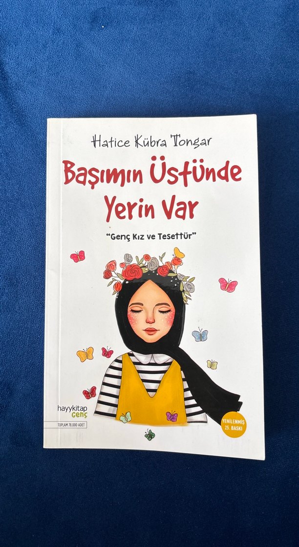 Hatice Kübra Tongar'ın "Başımın Üstünde Yerin Var" kitabı, genç bir kız ve tesettür üzerine temalar içerir. Renkli ve anlamlı kapak tasarımı vardır.