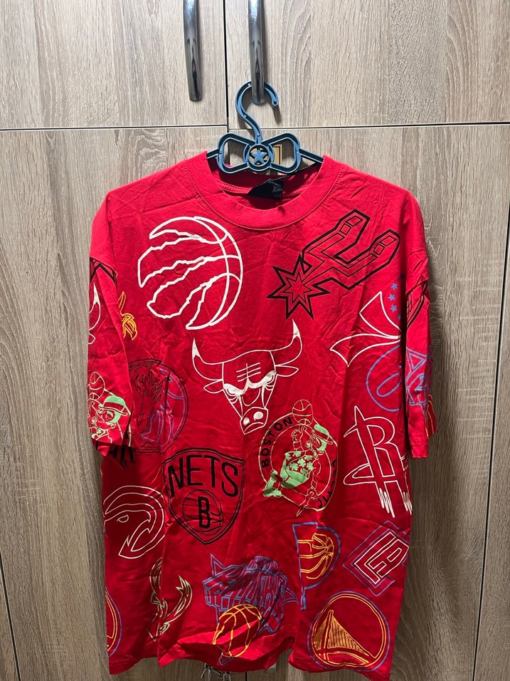 Kırmızı renkli, renkli baskılı spor logolarıyla süslenmiş, kısa kollu ve bisiklet yaka, bol kesim erkek tişörtü. Örme dokuma kumaştan, sportif ve rahat kullanıma uygundur. şort ile beraber Premium Pamuk Kumaş çekme solma yapmaz baskısı silinmez Beden bilgisi ve alım için iletişime geçiniz