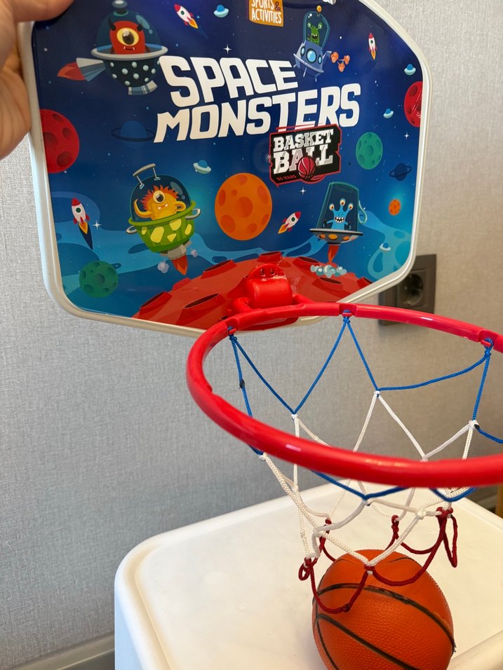 Kırmızı pota ve uzay canavarları temalı renkli arka planlı basketbol seti. Küçük basketbol topu ile birlikte gelir.