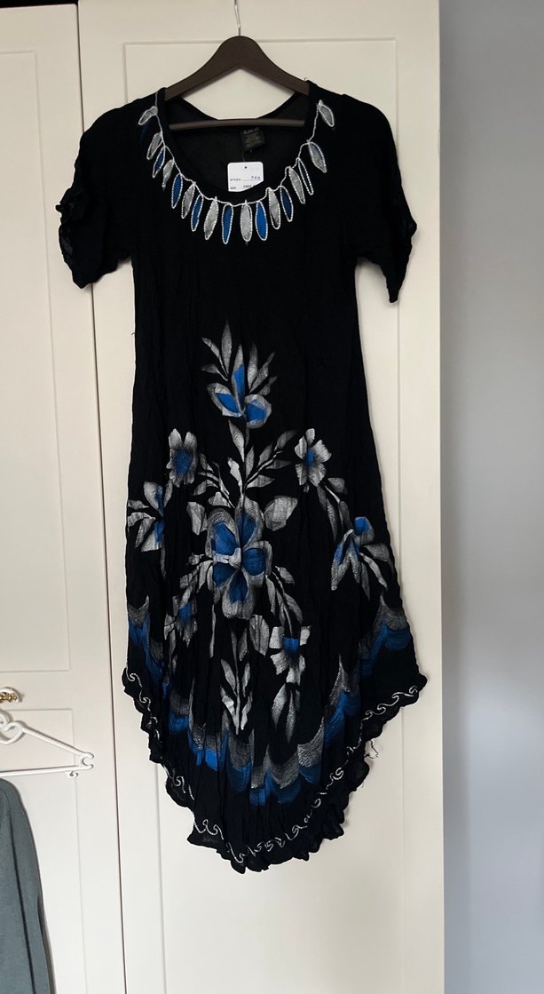 Baskı detaylı, kısa kollu, kayık yaka siyah bohem uzun elbise, koyu tie-dye çiçek desenlidir.