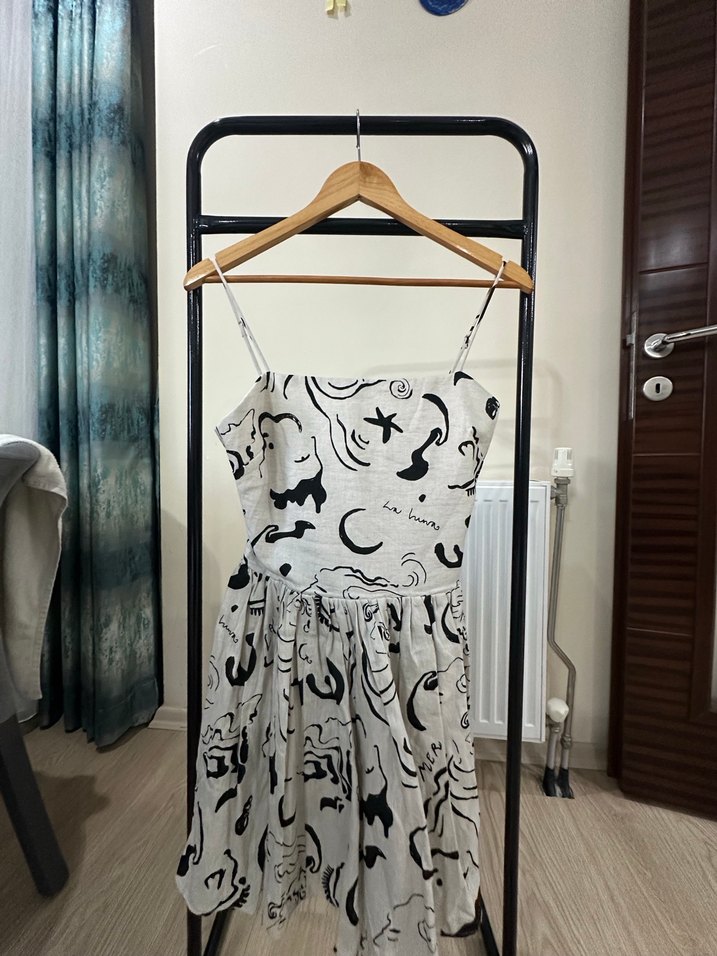 Askılı, straplez yakalı ve dökümlü tasarıma sahip uzun, bol kesim keten elbise. Gri ve beyaz baskılı desenlerle günlük kullanım için uygundur.