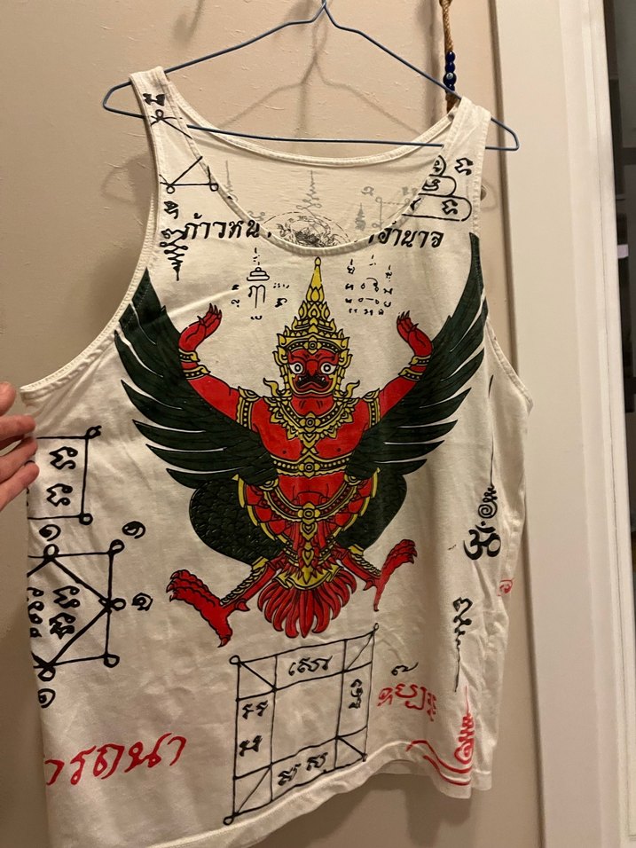 Askısız yakalı, bol kesim baskılı tişört uzun -bol boyda, günlük kullanıma uygun, beyaz, yoga vedik hint tarzında baskılar #yoga #garuda %100 pamuk Tayland’dan alindı. L beden ama bol da giyilir şortlarin uzerine