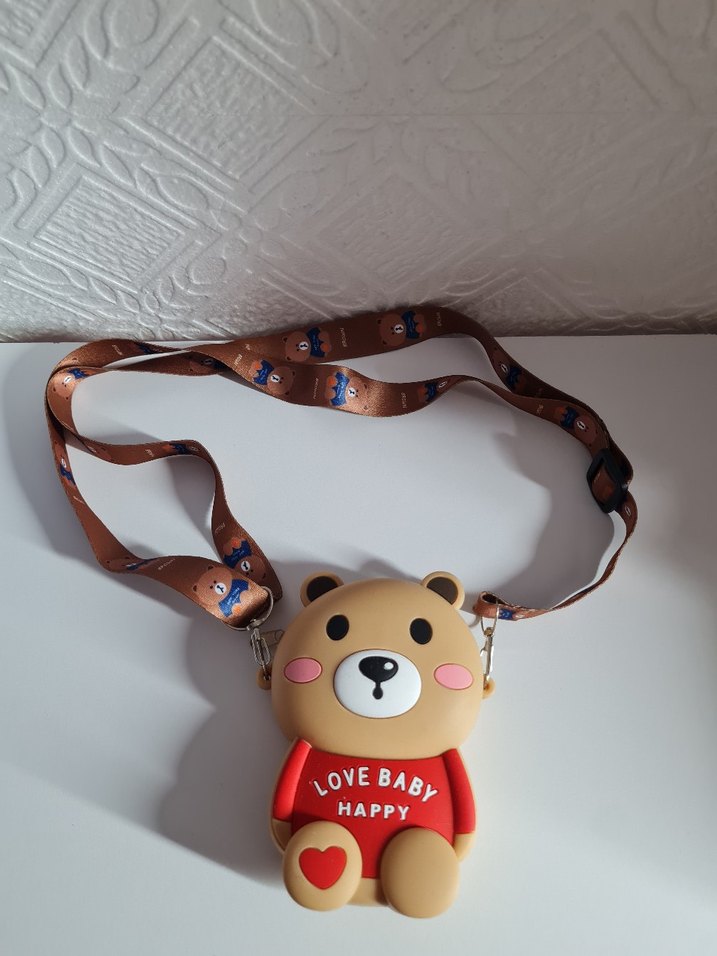 Kahverengi ayıcık figürlü çocuk çantası, renkli baskılı kayış ve tokalı kapama ile. Önünde "LOVE BABY HAPPY" yazısı bulunur.