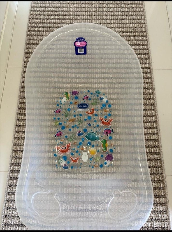 Şeffaf taban üzerinde çok renkli deniz canlıları baskılı banyo matı, gri tonları ve desenle uyumlu pratik bir üründür.