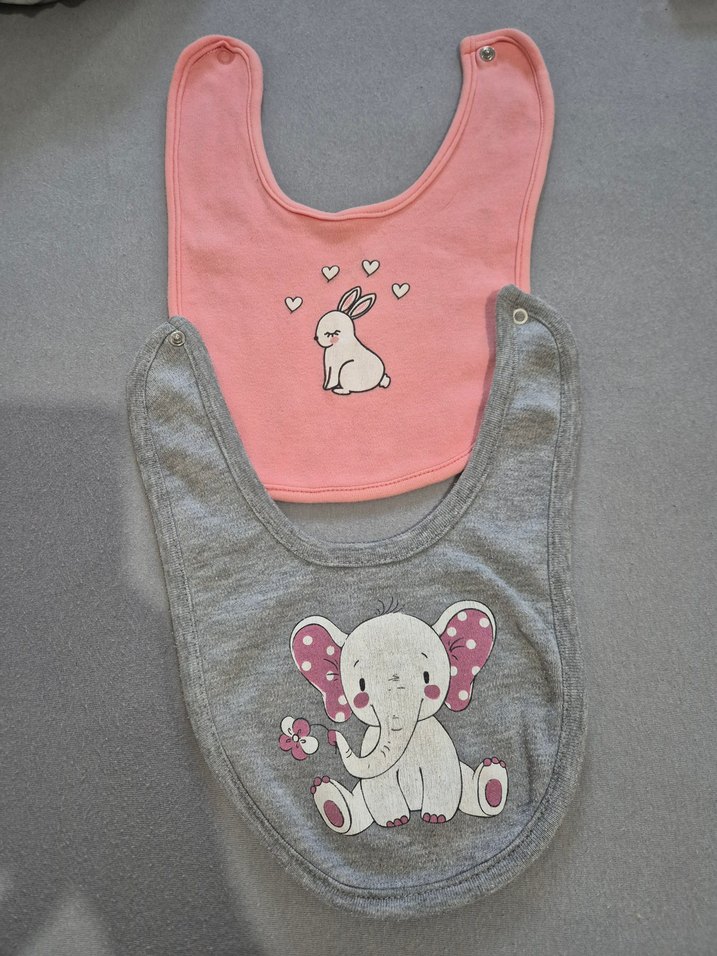 Baskılı iki bebek önlüğü, biri pembe tavşanlı, diğeri gri fil desenli. Kolay kullanım için çıtçıtlı.