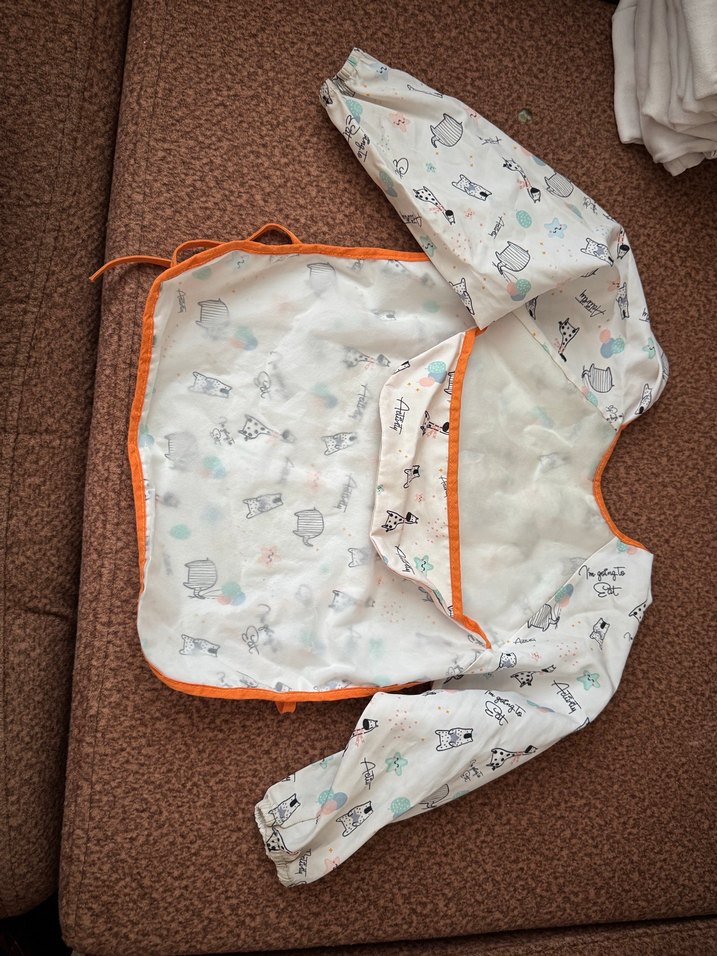 Uzun kollu, baskılı ve pastel kahverengi tonlarında olan bu bebek önlüğü, beslenme sırasında tam koruma sağlar.