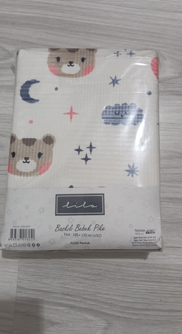 Ayıcık ve yıldız desenli, açık renkli, %100 pamuk yumuşak ve nefes alabilir bebek pikesi. Ölçü 100x130 cm.