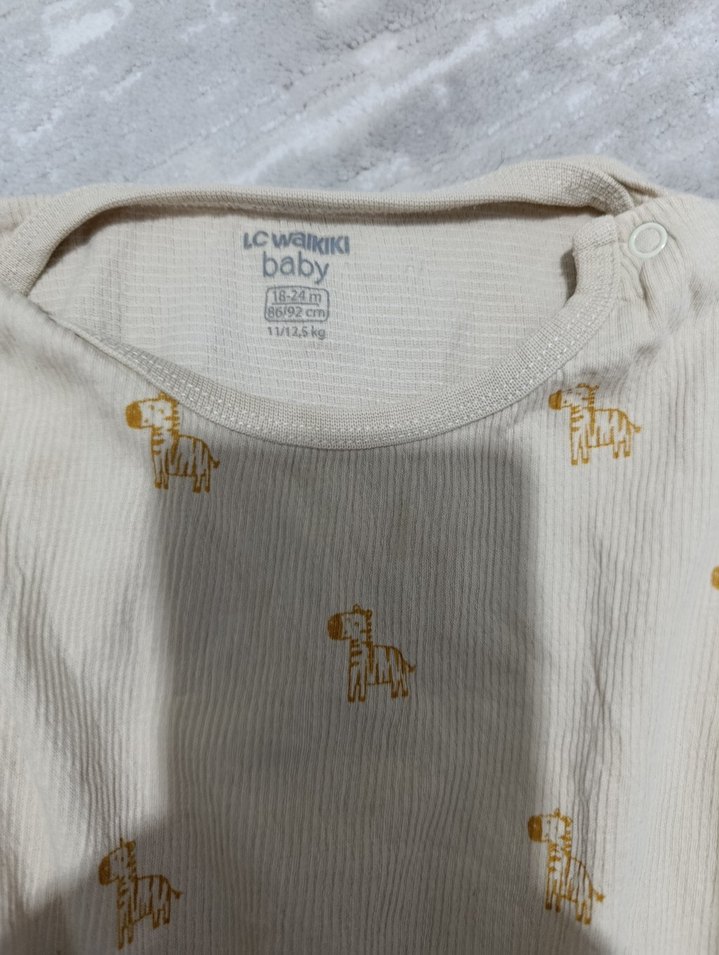 Bej renkli bebek içliği, küçük hayvan baskılarıyla süslenmiştir. Yumuşak kumaştan üretilmiştir.