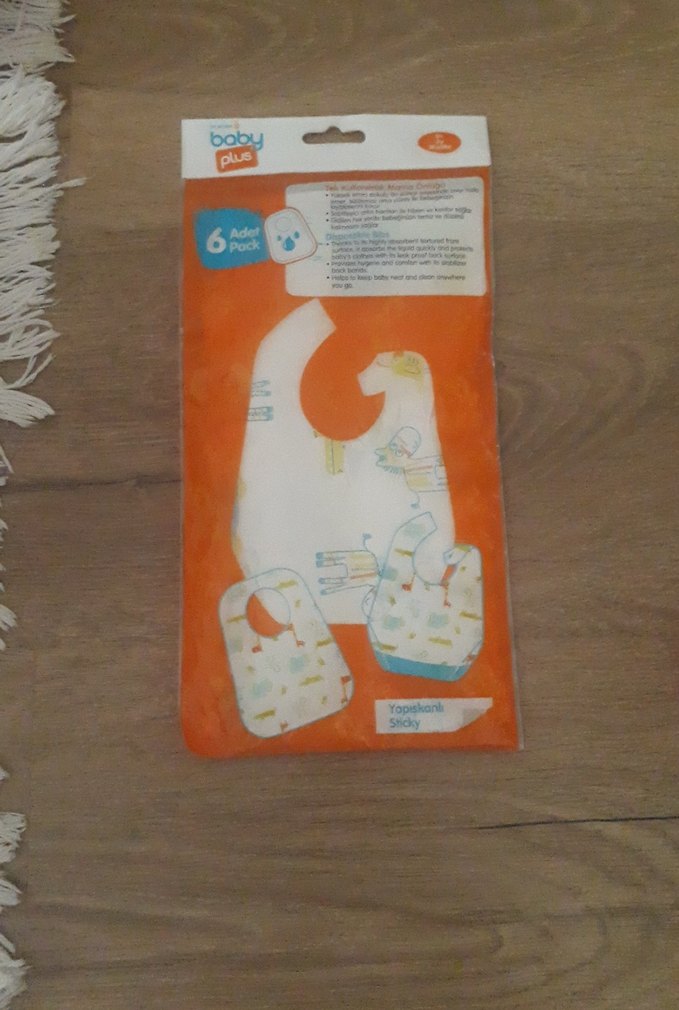 6'lı paket halinde, baskılı desenlere sahip açık bej renkli bebek önlükleri. Yumuşak ve temizlemesi kolaydır.