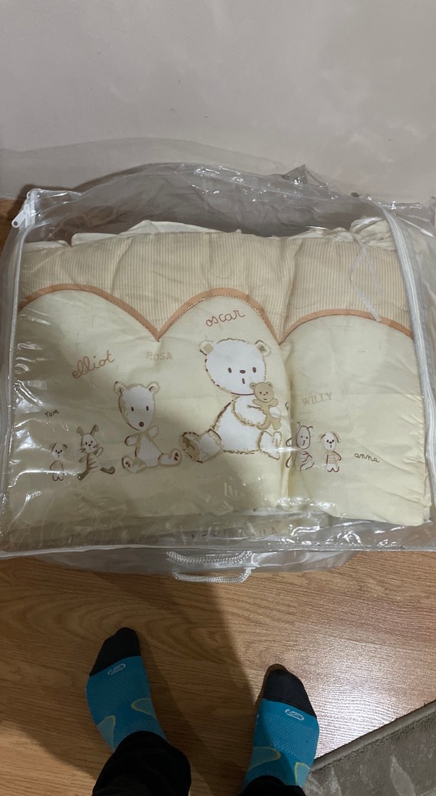 Yumuşak, tüylü kumaştan yapılmış bej renkli, baskılı çocuk uyku aksesuarı. Pastel hayvan desenleri ve taşıma çantası içerir.