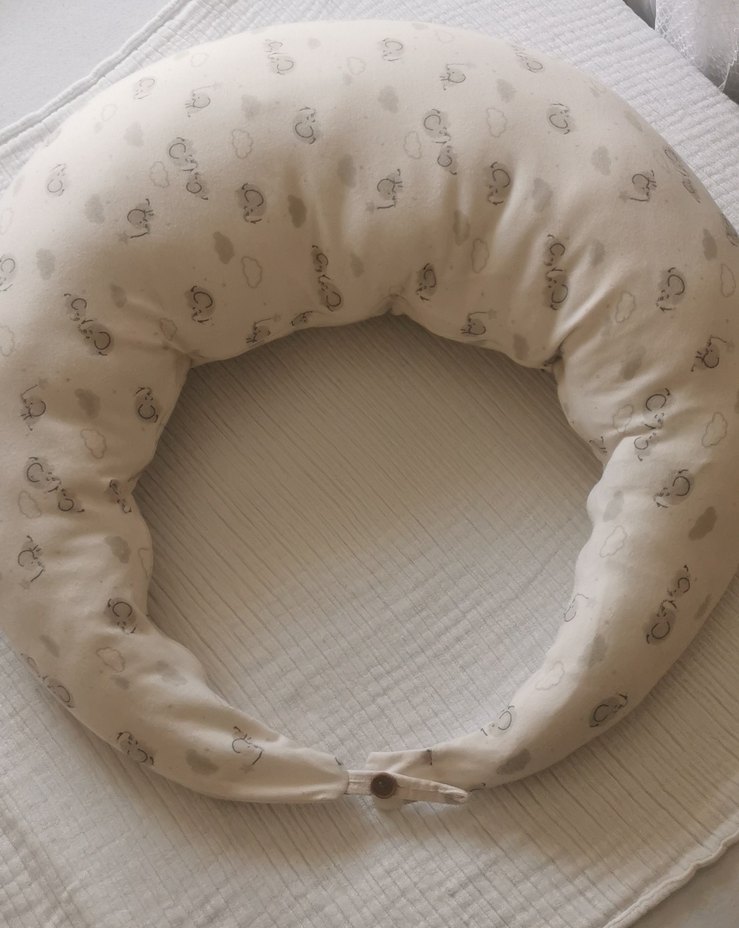 Gri baskılı desenli bej renkli, hamilelik ve emzirme sırasında destek sağlayan yumuşak yastık.
