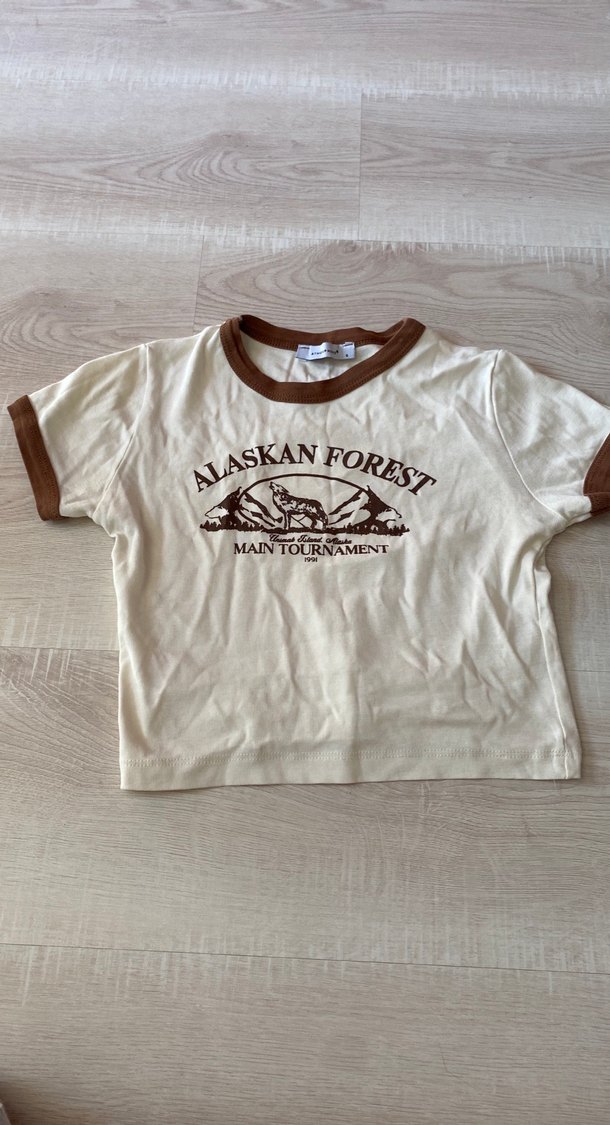 Pamuk kumaştan, baskılı Alaskan Forest desenli, kısa kollu, bisiklet yakalı, bej renkli, dar kesim kadın tişörtü. Sokak stiline uygun, rahat ve şık.