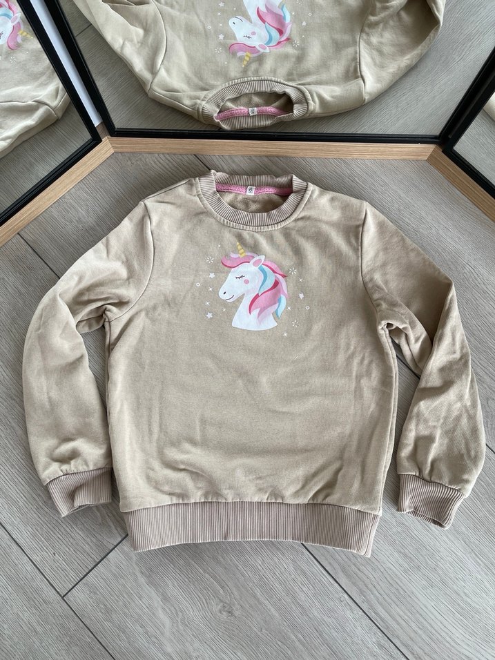Yumuşak ve sıcak kumaştan, bol kesim bej kız sweatshirtü. Uzun kollu ve bisiklet yaka, baskılı unicorn deseniyle sokak modasına uygun. Fotoğraflarda görüldüğü gibidir
