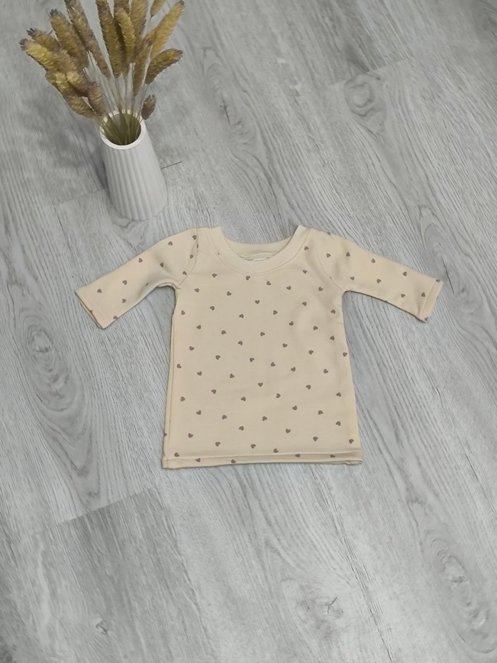 Baskılı desene sahip krem bebek elbisesi, uzun kollu, şardonlu ve yumuşak dokulu kumaştan yapılmıştır.