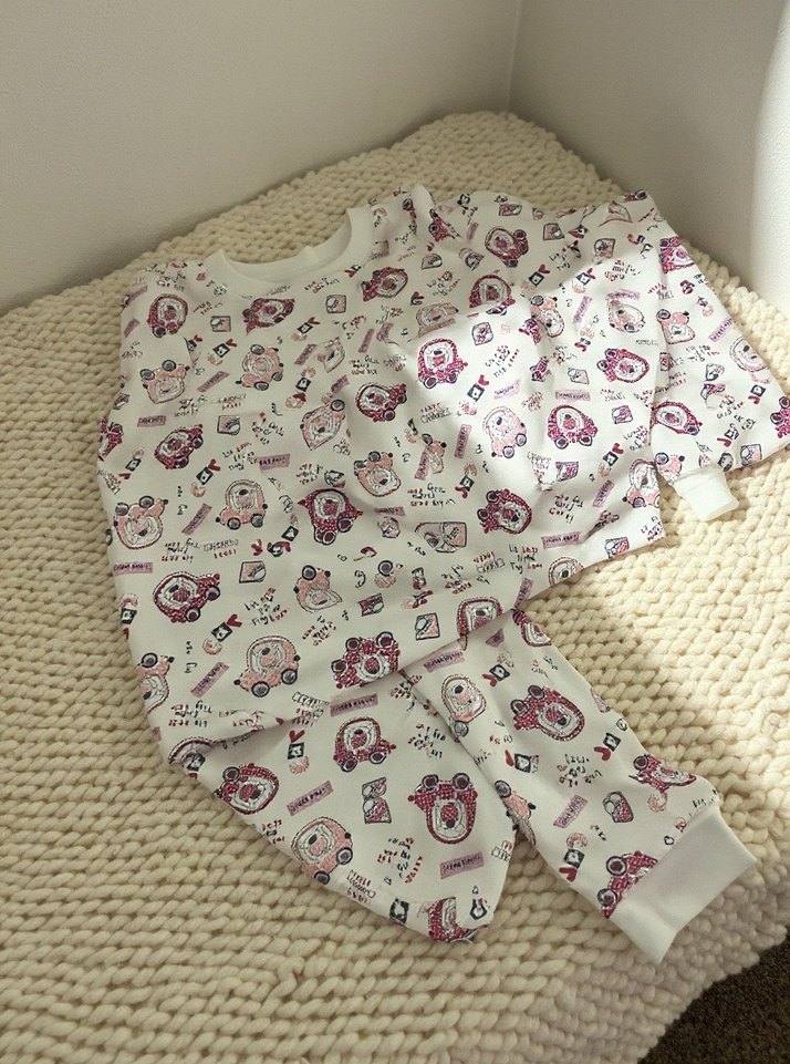 Beyaz 2 iplik şardonsuz kumaş üzerine renkli baskılı desene sahip, uzun kollu bebek kız takımı.