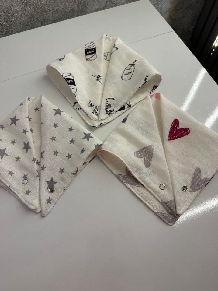 Yumuşak kumaştan, gri baskılı desenlere sahip beyaz bebek önlükleri seti.
