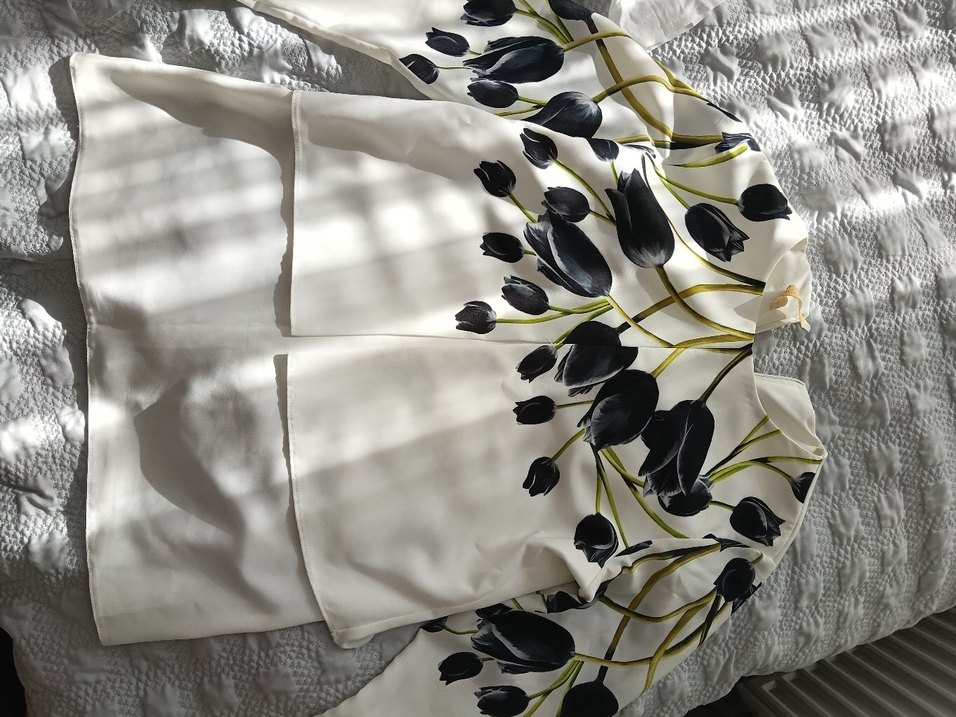 Beyaz baskılı etek üstü bluz. koyu lale desenleriyle çağdaş baskılı tasarıma sahiptir. Kumaşı pürüzsüz ve şık görünümlüdür.