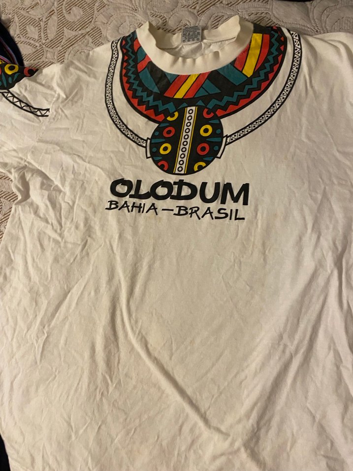 Pamuklu, bol kesim beyaz hamile tişörtü, renkli baskılı desenle Bahia-Brasil Olodum esintili. Yuvarlak yaka ve kısa kollu, bohem parti tarzı için uygun.