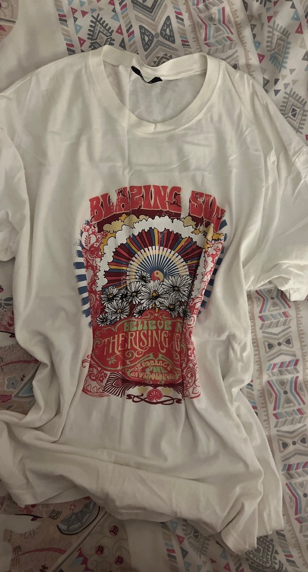 Beyaz pamuklu, bol kesim kısa kollu tişört. Parlak baskılı bohem desenli, yuvarlak yaka ve günlük kullanım için uygun.