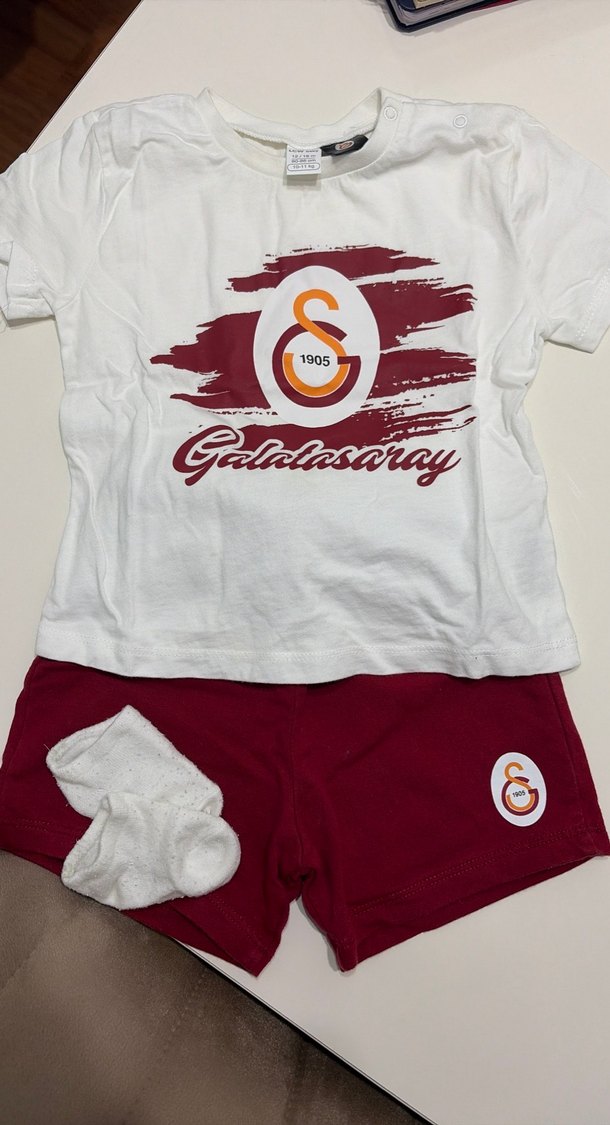 Baskılı beyaz parlak çocuk atlet takımı, Galatasaray logosu ve uyumlu bordo şort ile rahat ve sportif bir set. ⚽